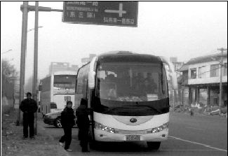 接托儿的客车停在路边集结,等候着出发的命令。