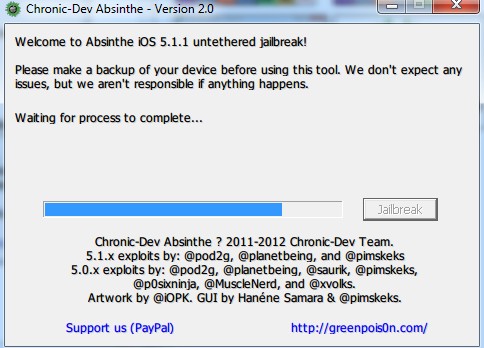 【苹果园越狱教程】5月25日,iOS5.1.1系统完美越狱工具Absinthe2.0正式发布,支持iPhone4/4S/3GS、iPad1/2/3、iPod4/3,不支持最新版的iPad2(型号为iPad2.4)。