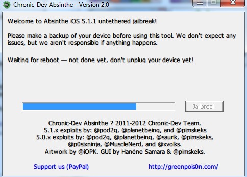 小提示:如果您没有备份过您的设备,越狱可能会经历非常长的等待时间,此时可以断开连接之后,关闭Absinthe程序,打开iTunes给设备进行一次备份之后,再次越狱。