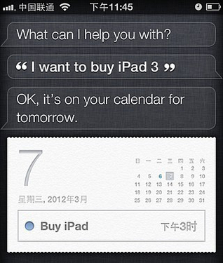 一位中国的iPhone4S用户在问Siri,我想买iPad3时候。Siri很贴心的给出了正确的答案!在7号可以买iPad3!
