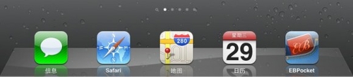 观察邀请函的照片中水滴的位置和图标的间隔,用手中的iPad 2找到了接近的Dock图标布局——纵向放置,Dock中保留5个应用程序图标。