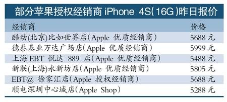 本报记者昨日调查发现,所有授权经销商的苹果iPhone 4S价格几乎都不同,但有一样是统一的,就是全部涨价。在广州天河城的一家苹果授权经销商店,16G的iPhone 4S报价5680元,32G报价6580元,但送用户200元购物券,而且可以马上拿机子。