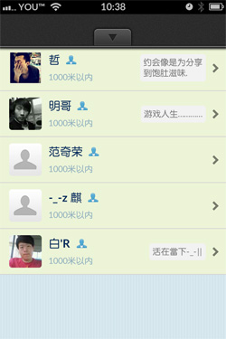 接下来是“摇一摇”:这个有些神奇,只需要摇动几下iPhone,就能看到同时在摇iPhone的朋友哦,而且是全球范围的!不过可惜的是,笔者摇得胳膊都酸了,还是一堆一堆的大老爷们,没见到MM…腐女们可以试试,同样是可以点击头像发送信息的。