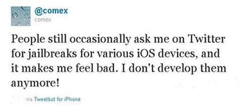 或许是当时的回答比较含糊,以至于还有部分Comex的粉丝仍然会认为他会在最困难的时候出来“拯救”越狱爱好者。不过,在看了日前Comex在Twitter上发出了这则“绝情绝义”的消息过后,对他抱有幻想的朋友应该可以死心了。