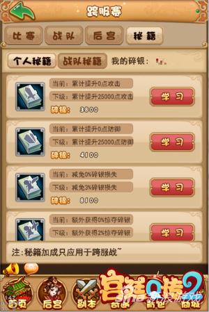参与此次跨服精英战的小主们都是宫廷翘楚,圣上贴心地为小主们准备好了盘缠,为各位送上碎银。碎银可以用于阅读秘籍,购买道具来让自己和队伍在偌大后宫之中脱颖而出。不过宫廷之中仍需谨慎,碎银是可以通过对战进行掠夺的哦。