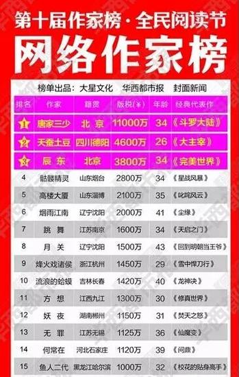 3月25日,第十届中国作家富豪榜正式发布“网络作家榜”入选名单,引起社会一片哗然,在排行榜中,入选的十五名网络作家年收入均突破一千万元,成为名副其实的千万富豪。