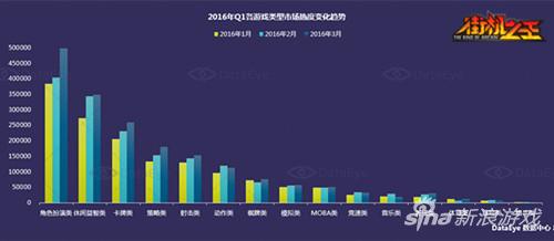 Data eye数据调查显示,2016年第一季度市场热度最高的游戏类型分别是角色扮演类、休闲益智类和卡牌类,也就意味着目前市场上还是这几类产品最多。在这样的环境下新游同类型的产品除非花大力气在推广上面,否则打开市场很有难度,而《街机之王》作为一款动作类手游,在这个时候进入市场也算是用于挑战市场短板,很容易做到异军突起。