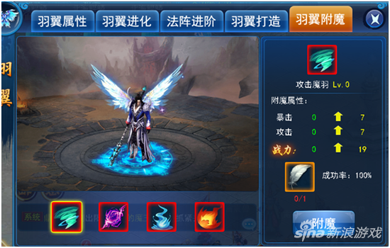 羽翼系统新增标签页[羽翼附魔],一共有4种属性的魔羽可供附魔,分别为:攻击魔羽、气血魔羽、防御魔羽、闪避魔羽,每种魔羽增加1-2种属性,界面如下图: