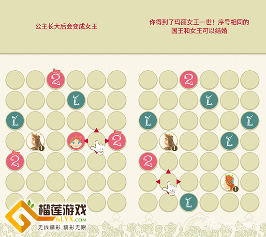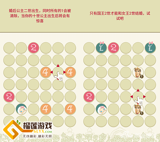 这之后,你便需要用相同的方法将公主2世升级为女王2世,而数字相加结果大于6时出现王子1世,两个王子1世相结合才能组成国王2世,与女王2世一起诞出下一世代的玛丽公主。以此类推,在所有空格被填满之前,争取达到更高世代的玛丽女王。