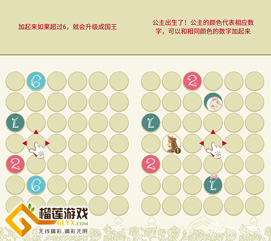游戏开始后,画面将出现几个随机数字和一个公主宝宝。将数字按照前文所说的找交接点的方式融合,直到相加结果大于6时,国王便会出现。公主可以和颜色相同的数字在交接点相加升级,直到成为女王。相同世代的国王与女王通过交接点结合并诞下公主。