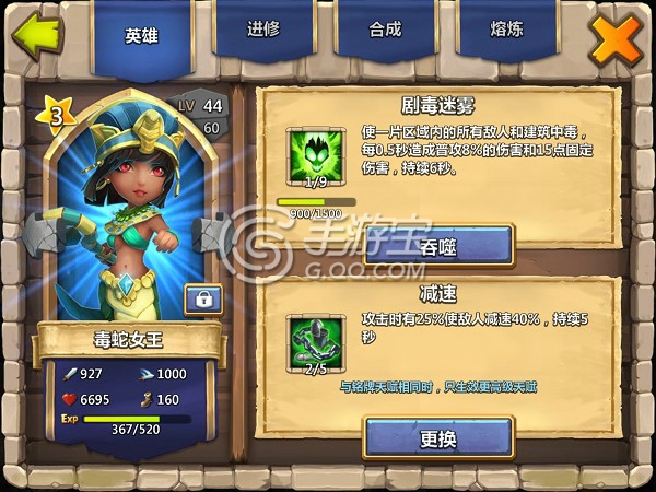 毒蛇女王清兵靠的是她的技能,为了能让她更早的放出技能,就需要第一个进入战场,打她的小兵越多,能量累积就越快,所以石肤这个稳定的减伤天赋非常适合毒蛇女王。